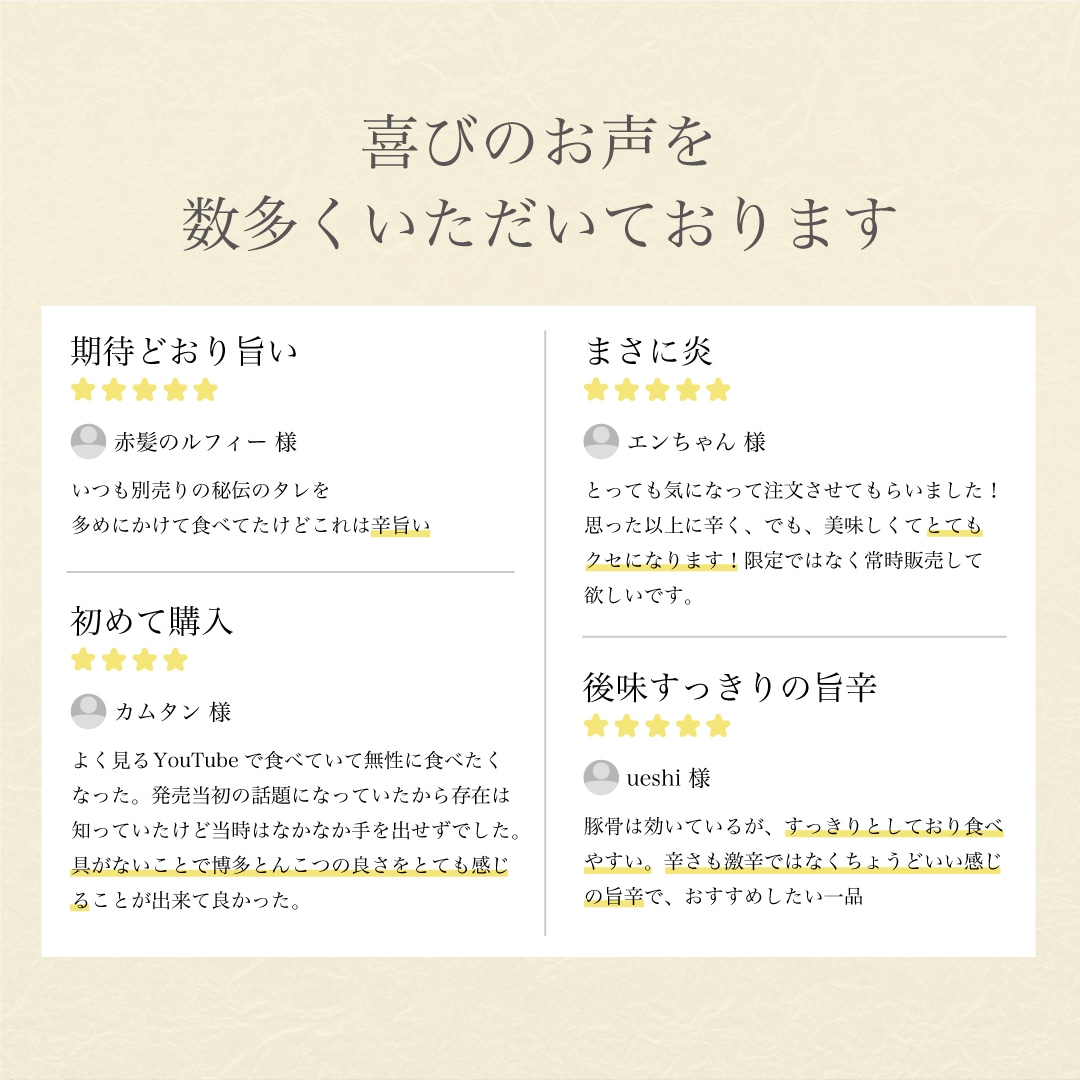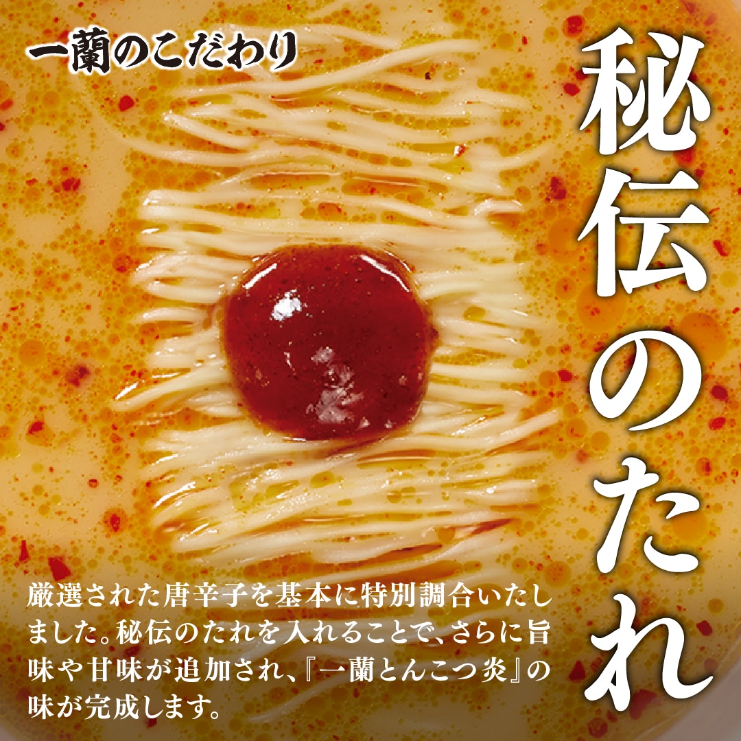 厳選された唐辛子を基本に特別調合いたしました。秘伝のたれを入れることで、さらに旨味や甘味が追加され、『一蘭とんこつ炎』の味が完成します。栄養成分表示 1食(130g)当たり ※推定値
