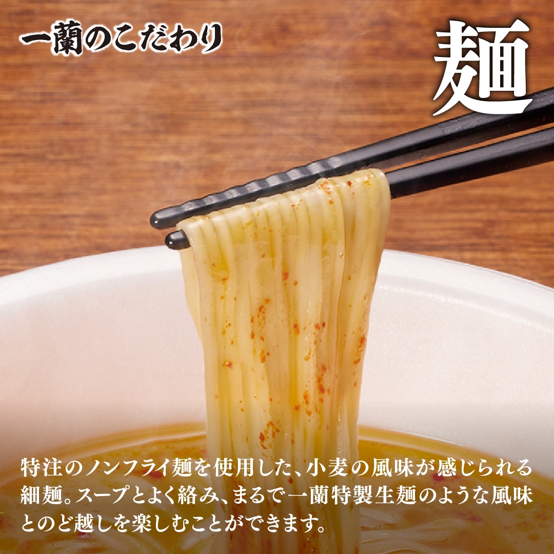 粒度の違う唐辛子を4種類配合。従来の「一蘭 とんこつ」のスープをベースに開発し、刺激的な辛さと、とんこつ本来の旨味のバランスを徹底的に追求したスープです。【麺】