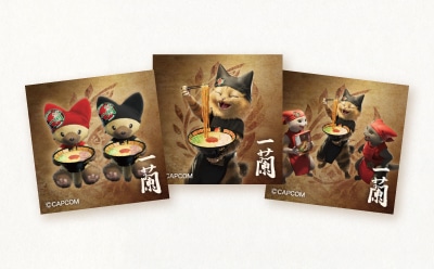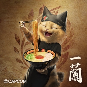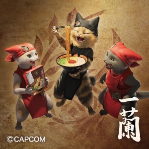 一蘭制服を着たアイルーと一蘭ラーメンのオリジナルデザインです。各セットでデザインが異なります。 画面越しにハンターやオトモと一緒に記念撮影もGoodです。
